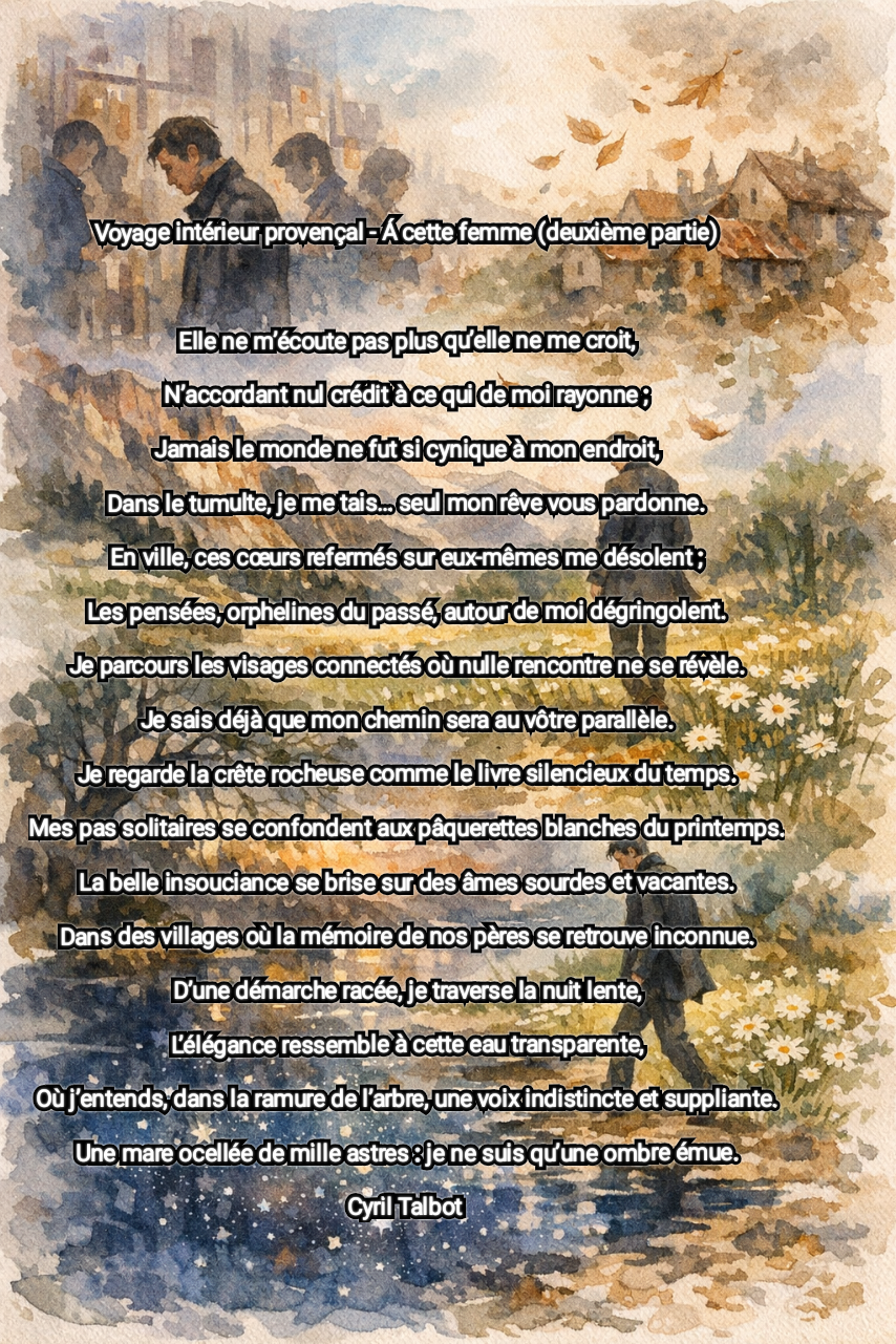 Ce recueil m’a surpris par sa sincérité et son souffle. Cyril Talbot écrit une poésie qui parle du cœur : une nature bienveillante, des scènes de vie, des rencontres, des luttes, des rêves… On voyage en Provence, on réfléchit au monde actuel, on ressent beaucoup d’humanité à chaque page. Une œuvre à la fois intime et engagée, qui m’a profondément touché.